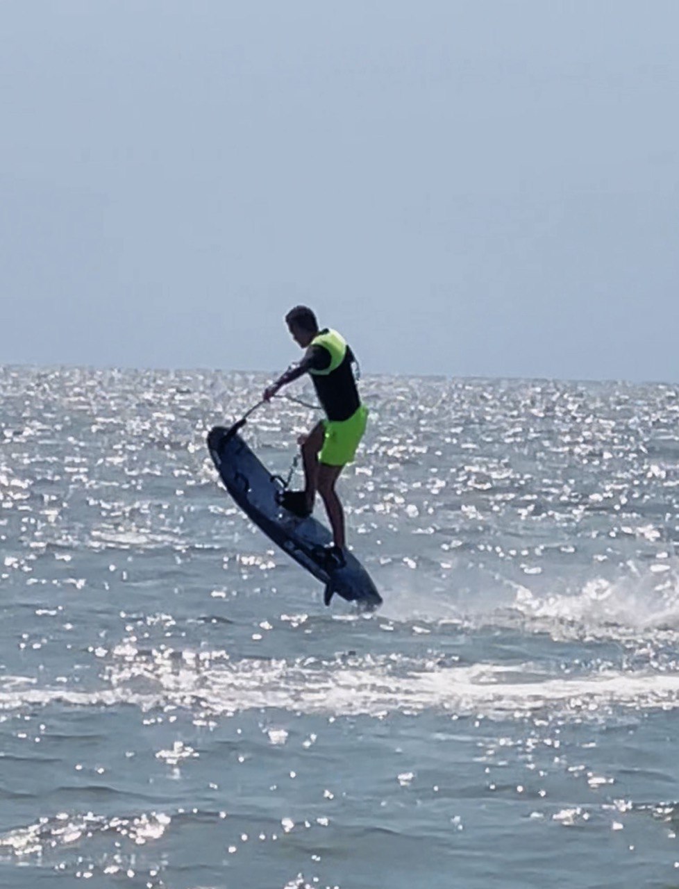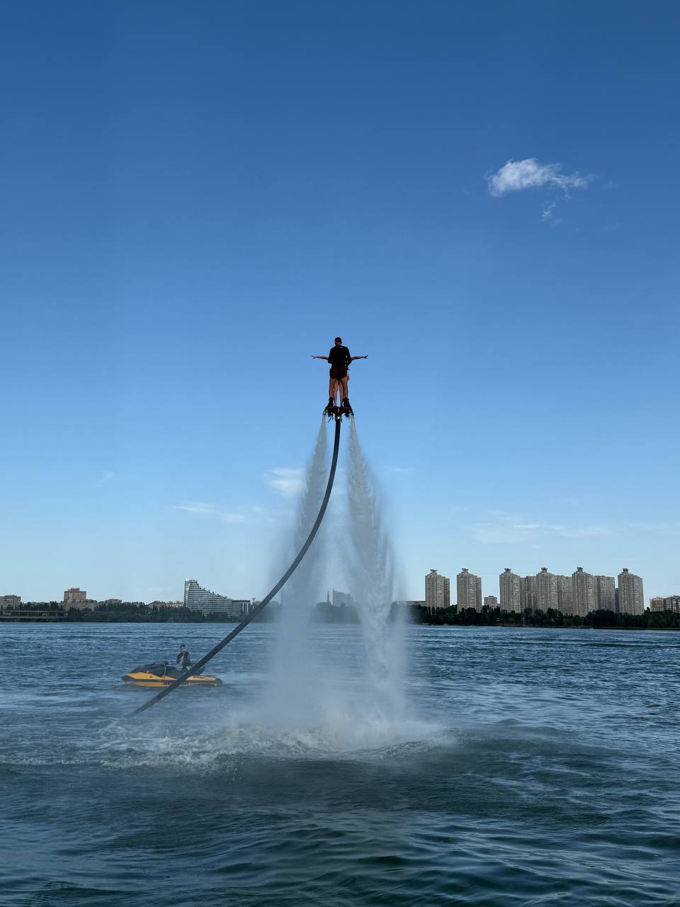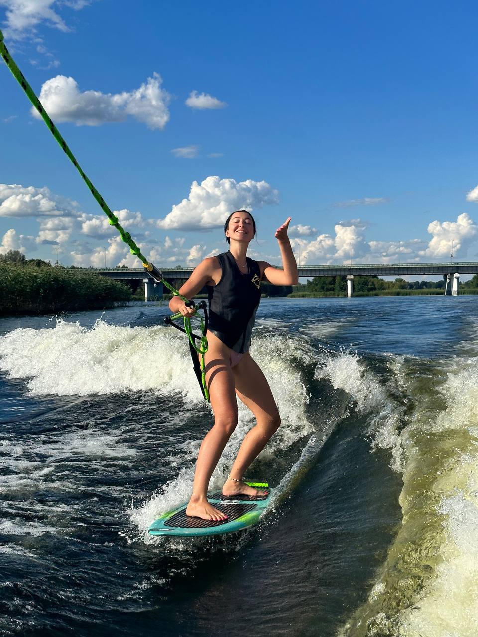 Это доска без креплений. Ты стартуешь, держась за фал (это такая ручка, соединённая с катером), как будешь готов — отпускаешь. Всё, ты в потоке. Катер создает идеальную волну, и ты скользишь по ней, словно по океанскому гребню 🌊🏄🏼♂️